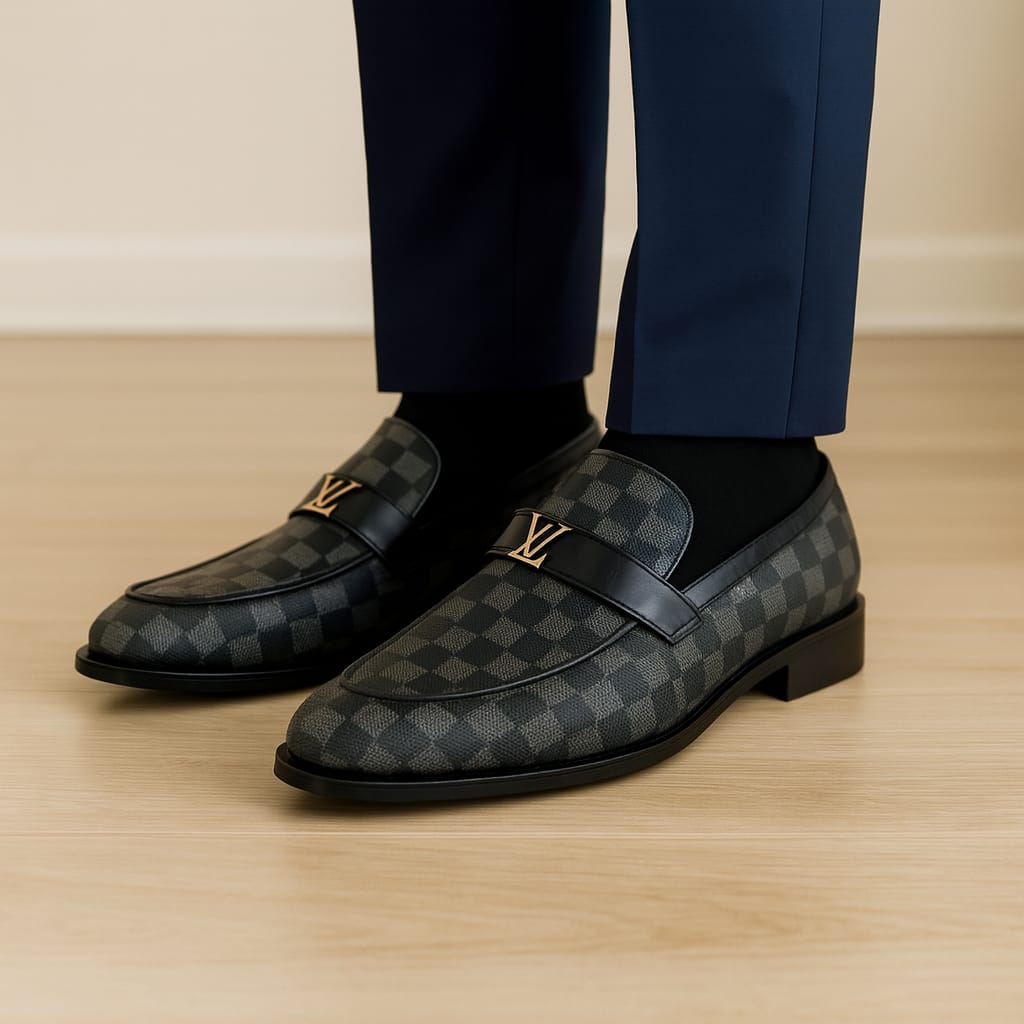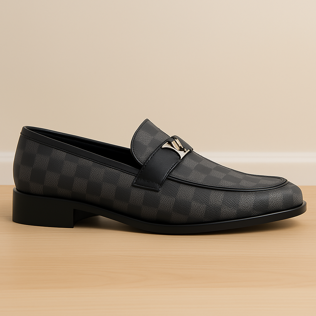 Elevate your formal and smart-casual look with these premium designer-inspired loafers, featuring the iconic checkered monogram pattern in a sleek black finish. Crafted from high-quality synthetic material (not leather), these shoes combine modern elegance with practical durability.